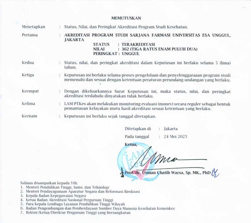PROGRAM STUDI: S1 FARMASI Peringkat Akreditasi : Unggul